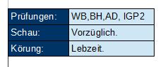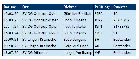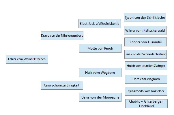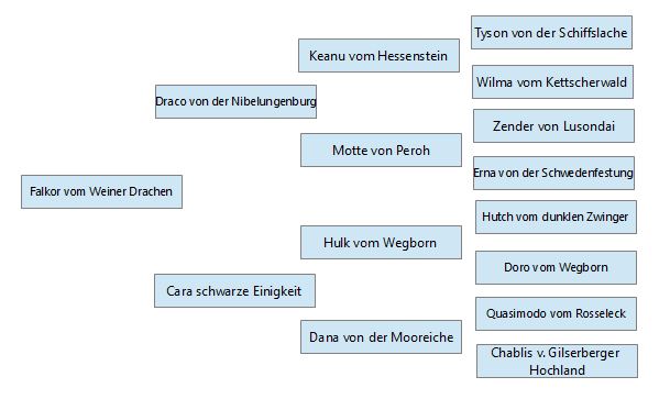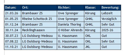 Körbericht: Knapp mittelgroßer, mittelkräftiger Rüde. Noch gutes Gepräge, normaler Widerrist, fester Rücken. Bei guter Länge ist die Kruppe leicht abschüssig. Gute Vor-, sehr gute Hinterhandwinkelung. Gerade Front. Ausgeglichene Brustverhältnisse. Vordermittelfuß sollte straffer sein. Vorne zeheneng und hinten annähernd gerade tretend zeigt er flüssige Gänge die jedoch mehr Raumgewinn haben sollten. Sicheres Wesen, TSB ausgeprägt.