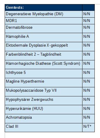 FREI (clear) N/N Das Testergebnis "frei" bedeutet, dass der untersuchte Hund KEINE Mutation für eine bestimmte genetische Erkrankung trägt.
