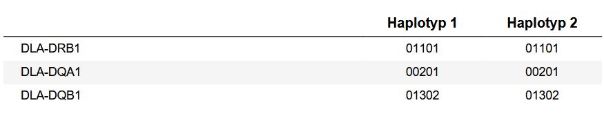 Haplotypen: Die genetische Analyse der drei DLA-Gene, DLA-DRB1, DLA-DQA1 und DLA-DQB1, zeigt, dass der getestete
