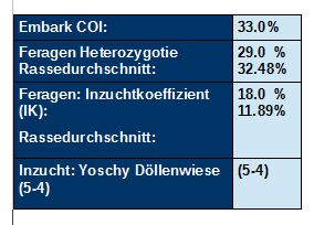 Inzuchtkoeffizient (IK)Der genomische IK wurde auf Basis der DNA, unter Berücksichtigung von 6 Generationen, berechnet. Je niedriger der COI-Wert, desto geringer der Inzuchtgrad.
