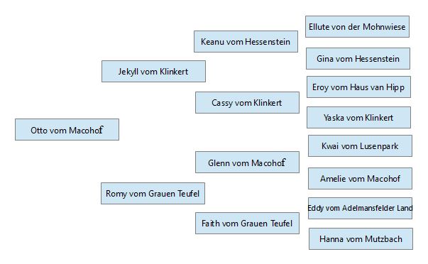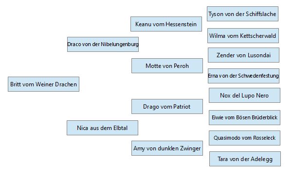 Körbericht: Übermittelgroß, mittelkräftig, gehaltvoll, hohe Widerrist, gerade Rücken, Croupe sollte etwas länger sein. Vorne und hinten sehr gut gewinkelt. Ausgeglichenene Brustverhältnisse, korrekte Front. Zeigt ein gerade Schrittfolge, kraftvolle Nachschub, Vortritt sollte noch ein nuance freier sein. Bei gute Präsentation, sicheres Wesen, TSB ausgeprägt.